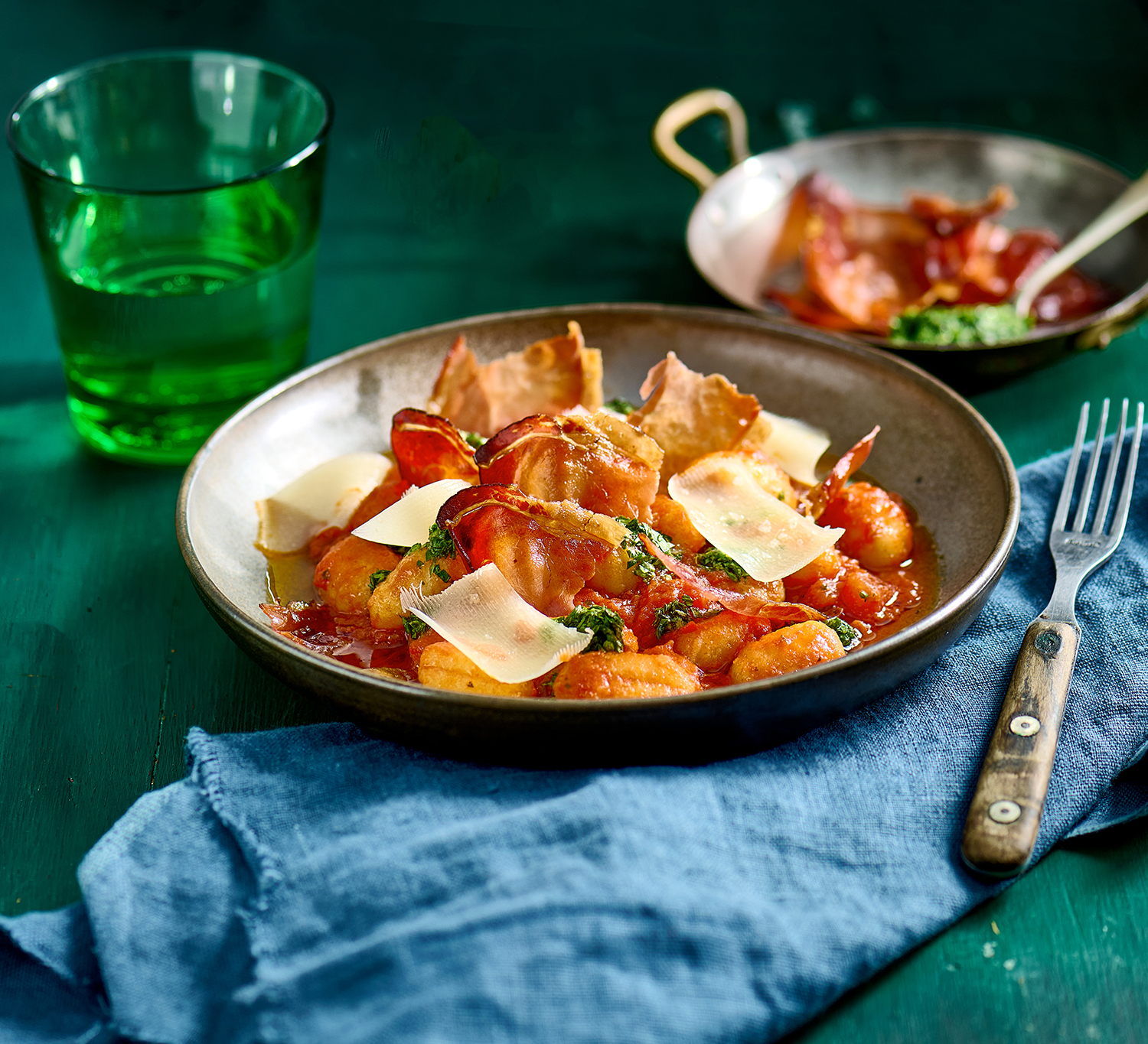 Gnocchi arrabiata feketeerdei sonka chips-szel, gremolatával és grana padanoval